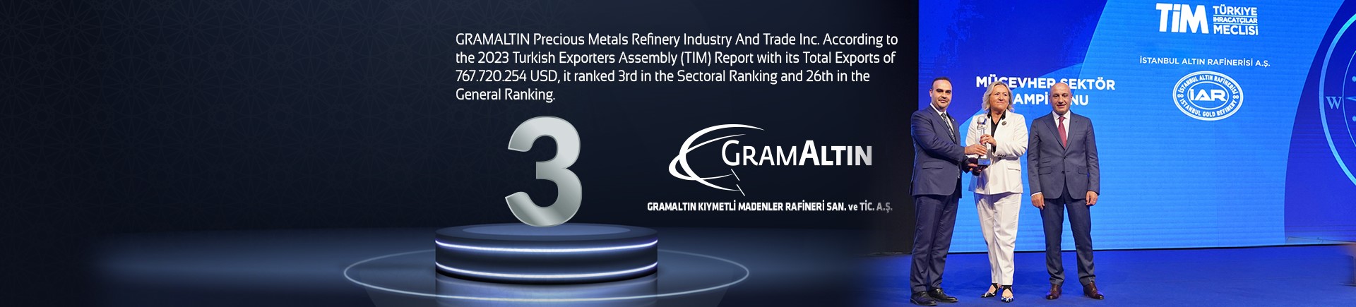 With a total export of 767,720,254.62 USD, GRAMALTIN PRECIOUS METALS REFINERY INC. ranked 3rd in the sectoral ranking and 26th in the overall ranking according to the 2023 report by the Turkish Exporters Assembly (TIM).